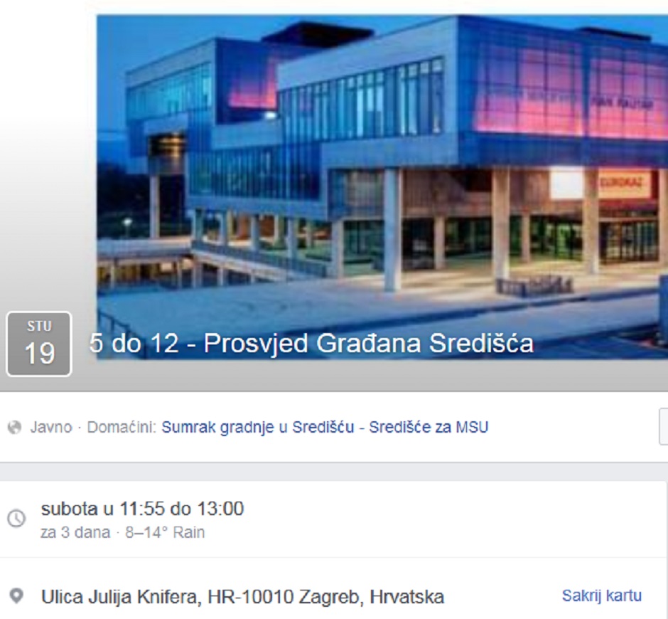 "Danas u Središću, a sutra se isto može dogoditi i u Vašoj četvrti! Prosvjedno okupljanje održat ćemo u subotu, 19. studenog s početkom u 11:55 sati na istočnoj strani Muzeja suvremene umjetnosti - u ulici Julija Knifera! Građanska inicijativa SUMRAK GRADNJE U SREDIŠĆU - SREDIŠĆE ZA MSU!", stoji u pozivu.