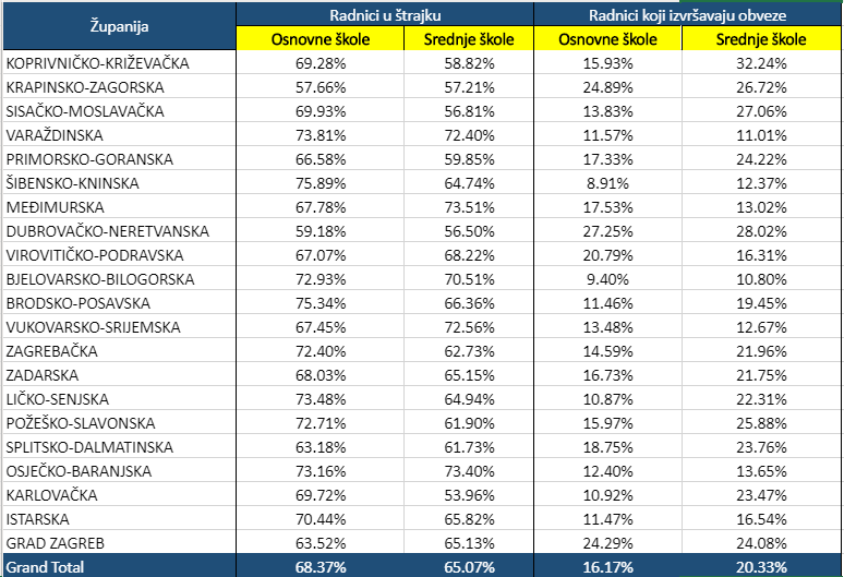 Ministarstvo znanosti i obrazovanja objavilo je podatke o postotku učitelja koji su štrajkali u osnovnim i srednjim školama po županijama. Brojke su, u odnosu na one koji su objavili sindikati, za 20 posto manje.