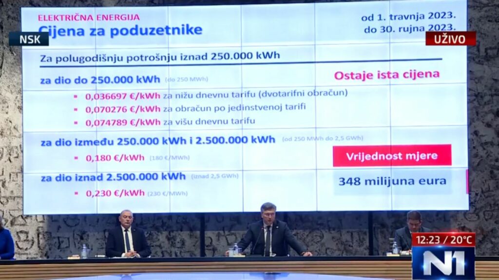 "Cijena za električne energije za javni i neprofitni sektor je sljedeći i idemo na cijenu 0,062 eura/kWh. Na ovaj način osiguravamo priuštivu cijenu za vrtiće, škole, fakultete, udruge itd.", dodao je. "Za malo poduzetništvo je 0,062 euro/kWh.