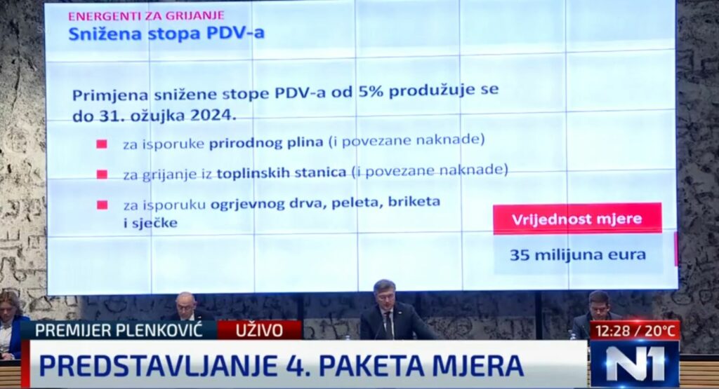 Produžuje se, također do travnja iduće godine, i primjena snižene stope PDV-a od pet posto za isporuke prirodnog plina, za grijanje iz toplinskih stanica, za isporuku ogrjevnog drva, peleta, briketa i sječke, a vrijednost mjere je 35 milijuna eura.