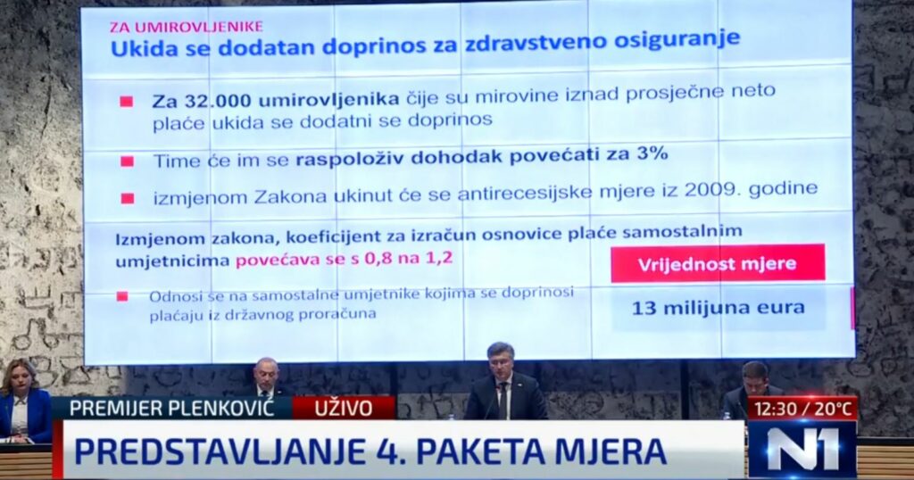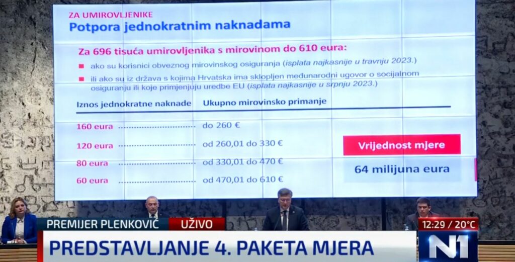 Premijer Andrej Plenković predstavio je u ponedjeljak okvir novog, četvrtog paketa mjera za zaštitu kućanstava i gospodarstva od rasta cijena, vrijednog 1,7 milijarde eura, a detalje je iznio u utorak. Najveći dio četvrtog Vladinog paketa mjera pomoći odnosi se na ublažavanje rasta cijena energije, za što će država osigurati 1,181 milijardu eura, za zaštitu od inflacije predviđeno je 169 milijuna eura, a za posebne potpore i poticaje 347 milijuna eura.