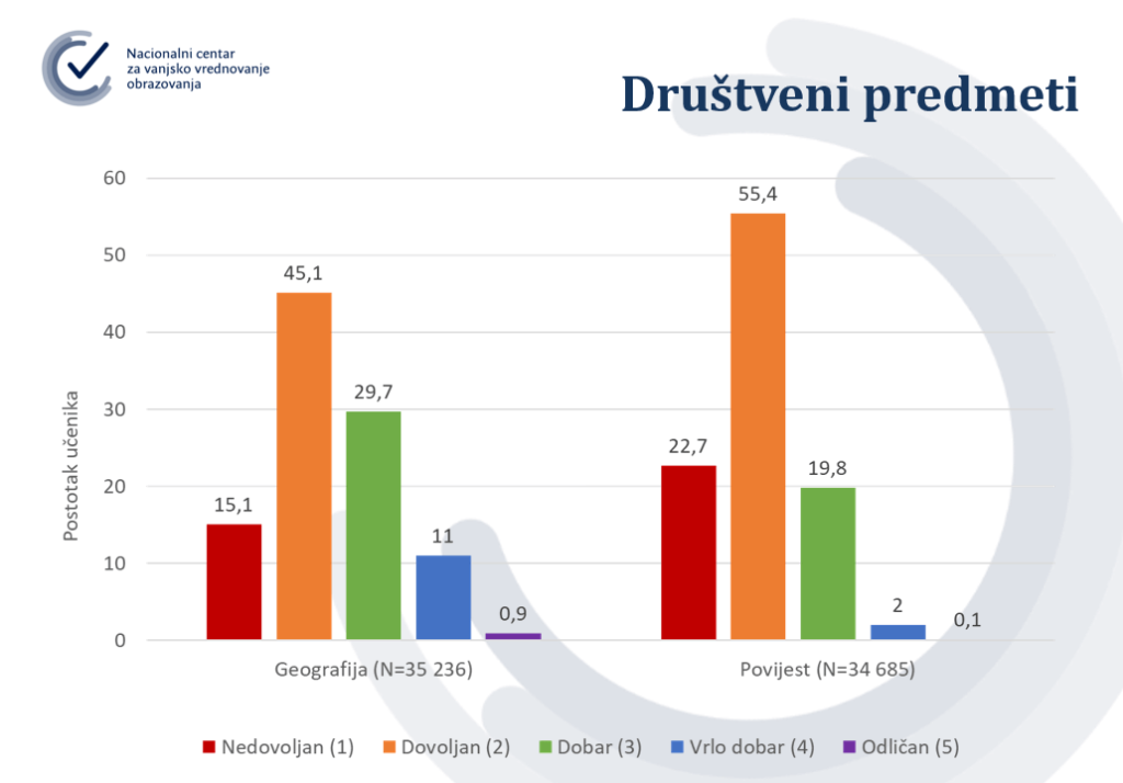 Na društvenim predmetima osmaši su najčešće dobivali dvojku. Tako je dvojku iz Geografije dobilo 45,1 posto osmaša, a jedinicu 15,1 posto. Povijest je predmet na kojem su osmaši dobili najviše jedinica – manje od 20 posto točnih odgovora imalo je 22,7 posto učenika. Na Povijesti je i najmanje petica, samo 0,1 posto, a dvojku je na tom ispitu dobilo više od polovine pristupnika.