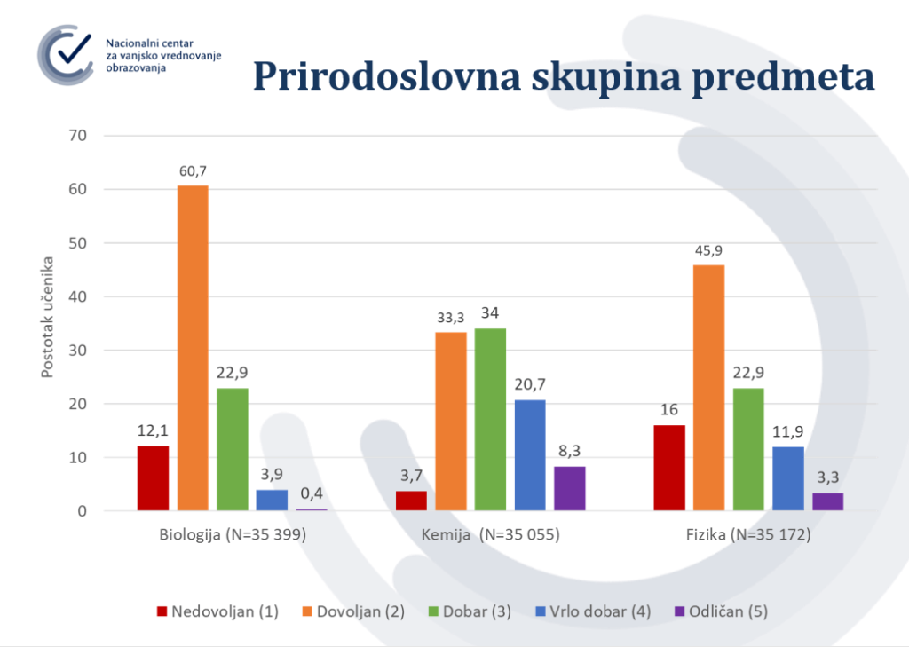 Na Biologiji je jedinicu dobilo 12 posto osmaša, a peticu samo 0,4 posto osmaša. Rezultati na Kemiji nešto su bolji jer je upola manje dvojki nego na Biologiji. No, na Fizici je zato jedinicu dobilo 16 posto osmaša, dvojku 45,9 posto, a peticu samo 3,3 posto osmaša.