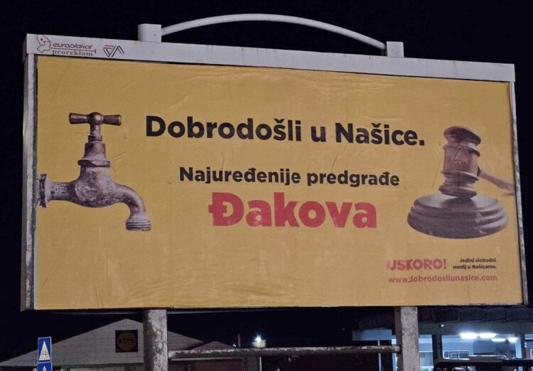 U proteklih desetak dana u Našicama i na prilazima gradu pojavilo se nekoliko jumbo plakata koji su privukli pažnju i prenuli Našičane. Na prvom osvanulom piše: "Dobrodošli u Našice. Najuređenije predgrađe Đakova." A uz tu poruku, na plakatu su slavina za vodu i sudački bat. Čitatelj, koji nam je proslijedio fotografije plakata, objasnio nam je "skriveno" značenje ovog plakata. Našice su, naime, u izboru Hrvatske turističke zajednice više puta osvajale titulu najljepše uređenog malog grada.
