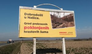 Na trećem plakatu "dobrodošlice u Našice" stoji da su "grad prekrasnih poklonjenih hrastovih šuma" čime se, opet nam tumači ovaj Našičanin u poslanom mailu, očito aludiralo na goleme šumske površine oko grada vraćene obitelji Pejačević koja je nekoć bila njihov vlasnik.