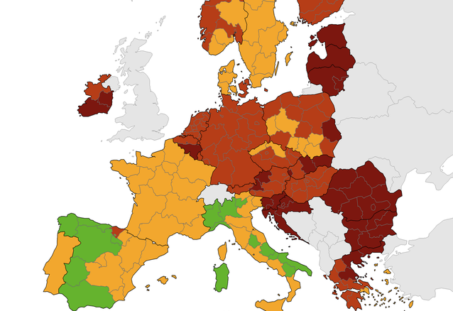 Crvena boja znači 14-dnevnu stopu od 75-200, s udjelom pozitivnih većim od 4 posto te područja u kojima je 14-dnevna stopa zaraženih od 200 do 500, a tamno crvena područja u kojima je 14-dnevna stopa veća od 500. Karta ECDC-a je savjetodavna, ali se neke države članice EU oslanjaju na nju prilikom uvođenja epidemioloških restrikcija po povratku u zemlju.