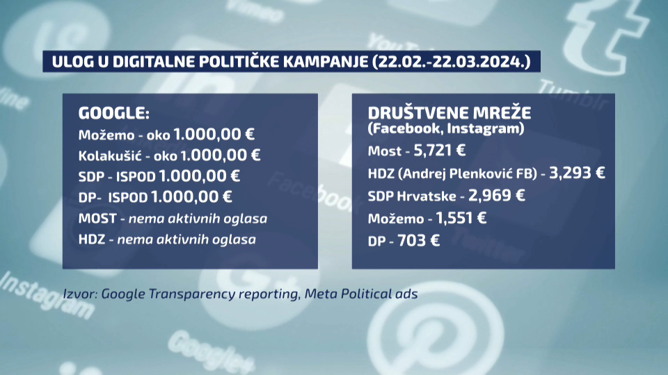 Političari se, osim u medijskom prostoru, trude pridobiti glasove birača u ovoj predizbornoj kampanji i preko društvenih mreža. Prema preliminarnim izvještajima, u mjesec dana na Googleu najviše su u političko oglašavanje uložili Možemo i Mislav Kolakušić - oko tisuću eura, manje od toga SDP i Domovinski pokret, dok Most i HDZ nemaju aktivnih oglasa.